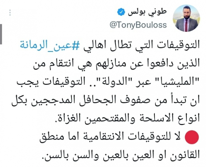 وأكد في تغريدة على حسابه بموقع التدوين المصغر تويتر، اليوم أن: "التوقيفات التي تطال أهالي عين الرمانة الذين دافعوا عن منازلهم هي انتقام من "المليشيا" عبر "الدولة".