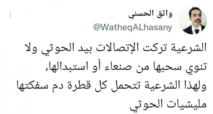 وأشار في تغريدة على حسابه بموقع التدوين المصغر تويتر، اليوم إلى أن: "الشرعية تركت الاتصالات بيد الحوثي ولا تنوي سحبها من صنعاء أو استبدالها، ولهذا الشرعية تتحمل كل قطرة دم سفكتها مليشيات الحوثي".
