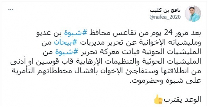 شدد الناشط السياسي نافع بن كليب، على أن معركة تحرير شبوة من قوى الاحتلال اليمني باتت قريبة، بعد تقاعس المدعو محمد بن عديو، عن تحرير بيحان.
