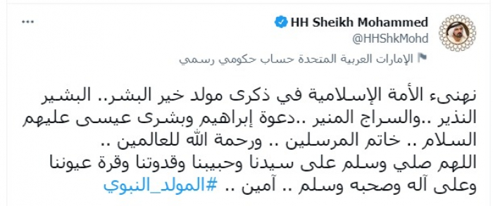 هنأ الشيخ محمد بن راشد آل مكتوم، رئيس مجلس وزراء الإمارات، حاكم دبي، الأمة الإسلامية، بذكرى المولد النبوي.