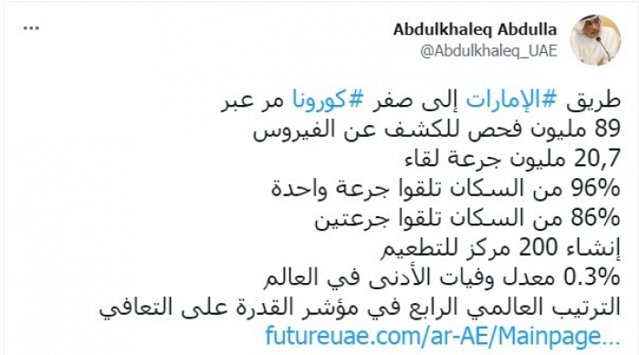 وكتب في تغريدة عبر "تويتر"، اليوم: طريق الإمارات إلى صفر كورونا مر عبر: