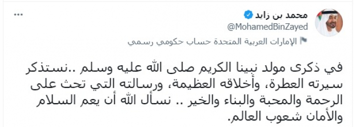 تحدث الشيخ محمد بن زايد آل نهيان ولي عهد أبوظبي، نائب القائد الأعلى للقوات المسلحة بالإمارات، عن ذكرى المولد النبوي.