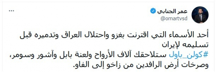 وواصل: "كولن باول ستلاحقك آلاف الأرواح ولعنة بابل وآشور وسومر، وصرخات أرض الرافدين من زاخو إلى الفاو".