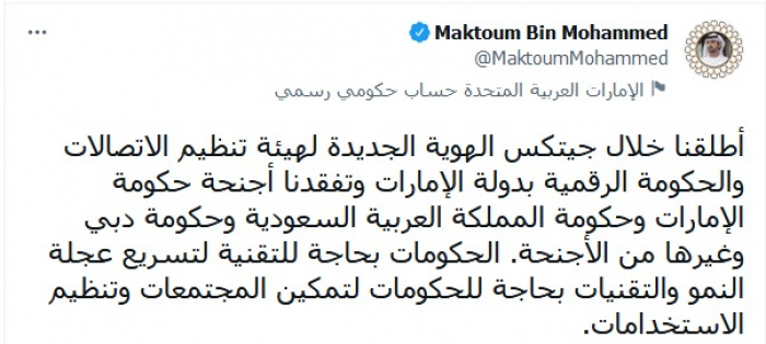 أطلق الشيخ مكتوم بن محمد بن راشد، نائب رئيس الوزراء وزير المالية الإماراتي، خلال معرض جيتكس غلوبال 2021، الهوية الجديدة لهيئة تنظيم الاتصالات والحكومة الرقمية بدولة الإمارات.