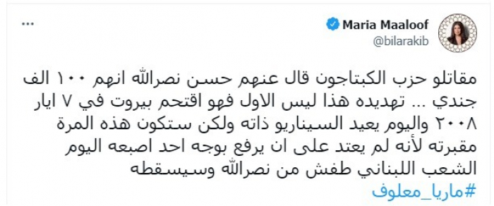 استنكرت الإعلامية اللبنانية ماريا معلوف، تهديدات زعيم مليشيا حزب الله المدعو حسن نصرالله، بأنهم 100 ألف جندي، مؤكدة أن الشعب اللبناني سيقطه هذه المرة.