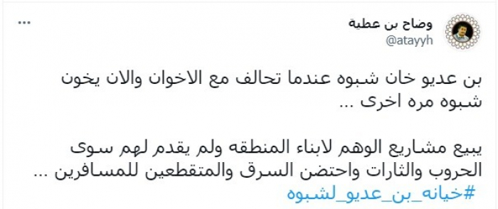 هاجم وضاح بن عطية، عضو الجمعية الوطنية بالمجلس الانتقالي الجنوبي، الإخواني المدعو محمد بن عديو، بعد خيانته لشبوة، واحتضانه للعناصر الإجرامية والمتطرفة.