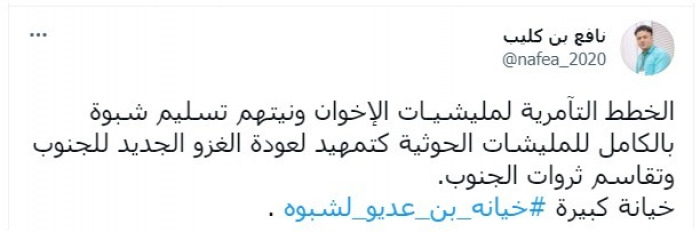 أكد الناشط السياسي نافع بن كليب، أن خطة مليشيات الشرعية الإخوانية لتسليم شبوة بالكامل لمليشيا الحوثي الإرهابية، تمثل خيانة عظمى للمدعو محمد بن عديو.