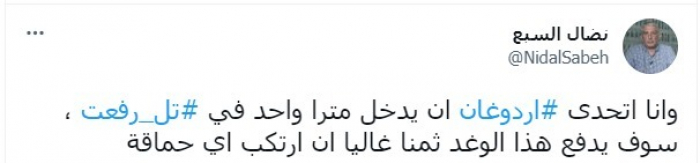 وكتب في تغريدة عبر "تويتر"، اليوم: "أتحدى أردوغان أن يدخل مترا واحدا في تل رفعت".