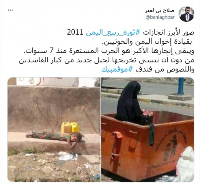 وعلق على هذه الصور قائلا: "أبرز انجازات ثورة ربيع اليمن 2011 بقيادة إخوان اليمن والحوثيين".