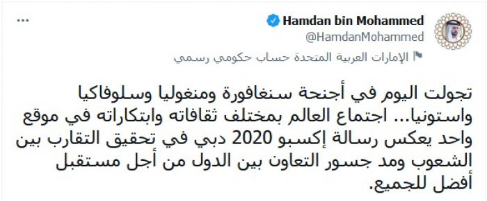 وقال في تغريدة عبر "تويتر"، اليوم: "اجتماع العالم بمختلف ثقافاته وابتكاراته في موقع واحد يعكس رسالة إكسبو 2020 دبي في تحقيق التقارب بين الشعوب ومد جسور التعاون بين الدول من أجل مستقبل أفضل للجميع".