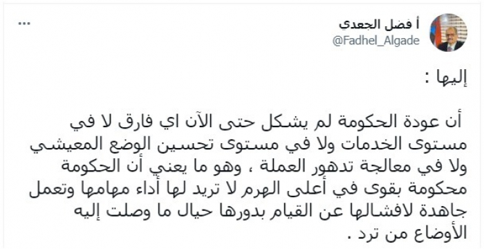 وأوضح في تغريدة عبر "تويتر"، اليوم، أن: "عودة الحكومة لم يشكل حتى الآن أي فارق لا في مستوى الخدمات ولا في مستوى تحسين الوضع المعيشي ولا في معالجة تدهور العملة".
