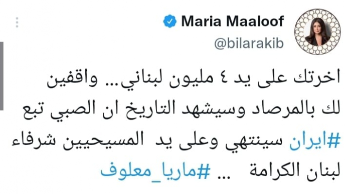 توقعت الإعلامية ماريا معلوف، نجاح الشعب اللبناني في القضاء على مليشيات حزب الله الموالية لنظام ملالي طهران وزعيمها.