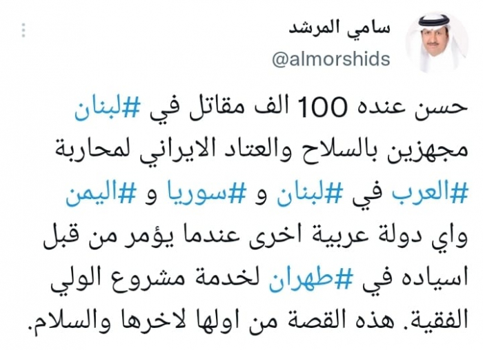 وشدد في تغريدة على حسابه بموقع التدوين المصغر تويتر، اليوم على أن: "حسن عنده 100 ألف مقاتل في لبنان مجهزين بالسلاح والعتاد الإيراني لمحاربة العرب في لبنان وسوريا واليمن وأي دولة عربية أخرى عندما يؤمر من قبل أسياده في طهران".