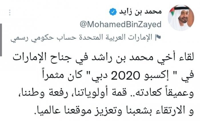 وقال في تغريدة على حسابه بموقع التدوين المصغر تويتر، اليوم إن: "لقاء أخي محمد بن راشد في جناح الإمارات في إكسبو 2020 دبي، كان مثمراً وعميقاً كعادته".