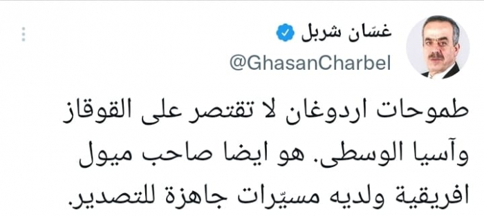 وأوضح في تغريدة على حسابه بموقع التدوين المصغر تويتر، اليوم أن: "طموحات أردوغان لا تقتصر على القوقاز وآسيا الوسطى، هو أيضا صاحب ميول افريقية ولديه مسيّرات جاهزة للتصدير".