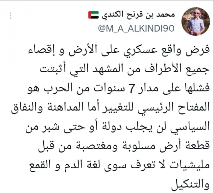 وقال في تغريدة على حسابه بموقع التدوين المصغر تويتر، اليوم إن: "فرض واقع عسكري على الأرض وإقصاء جميع الأطراف من المشهد التي أثبتت فشلها على مدار 7 سنوات من الحرب هو المفتاح الرئيسي للتغيير".