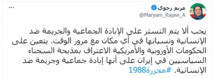 وطالبت الحكومات الأوروبية والأمريكية: "الاعتراف بمذبحة السجناء السياسيين في إيران على أنها إبادة جماعية وجريمة ضد الإنسانية"، مختتمة تغريدتها بهاشتاج "مجزرة 1988".