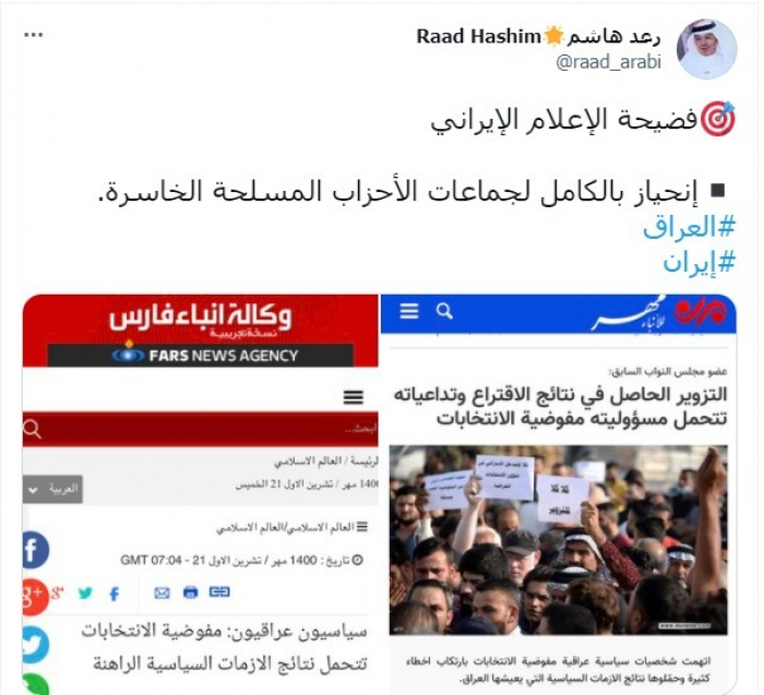 وصف المحلل السياسي العراقي رعد هاشم، انحياز الإعلام الإيراني لمليشيات إيران الخاسرة في الانتخابات البرلمانية العراقية بـ"الفضيحة".