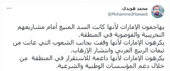وذكر في تغريدة عبر "تويتر"، اليوم، أن "الإمارات كانت السد المنيع أمام مشاريعهم التخريبية والفوضوية في المنطقة".