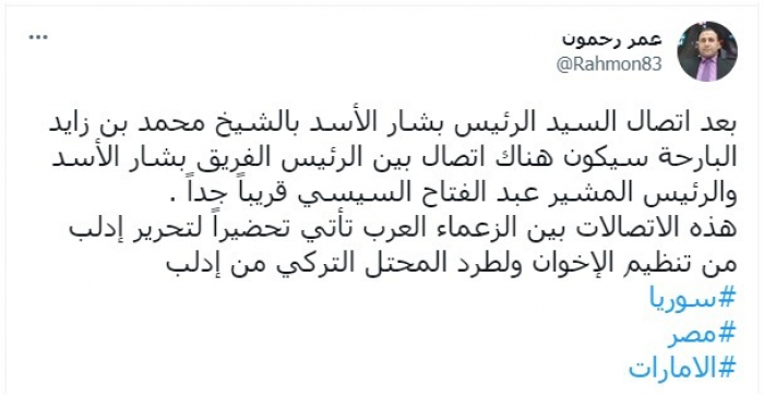 توقع المحلل السياسي السوري عمر رحمون، إجراء اتصال هاتفي بين الرئيس عبدالفتاح السيسي وبشار الأسد قريبا، بعد الاتصال الذي جمع الأخير مع الشيخ محمد بن زايد ولي عهد أبوظبي، أمس.