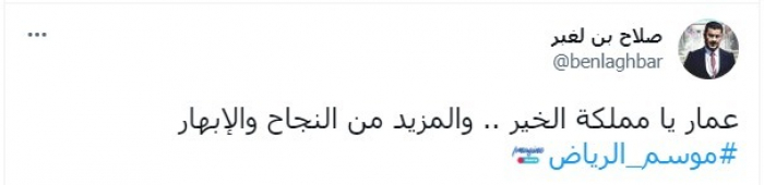 وكتب في تغريدة عبر "تويتر"، اليوم: "عمار يا مملكة الخير .. والمزيد من النجاح والإبهار"، مختتما تغريدته بهاشتاج: "موسم الرياض".