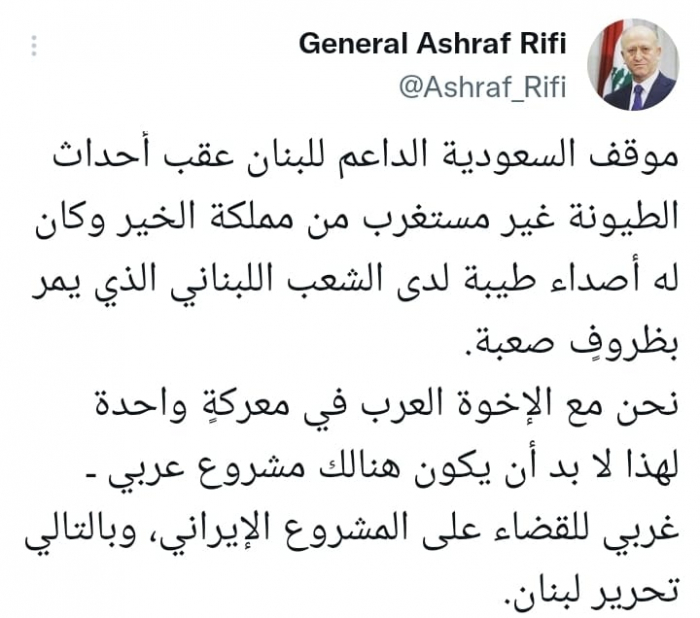 وقال في تغريدة على حسابه بموقع التدوين المصغر تويتر، اليوم إن: "موقف السعودية الداعم للبنان عقب أحداث الطيونة غير مستغرب من مملكة الخير وكان له أصداء طيبة لدى الشعب اللبناني الذي يمر بظروفٍ صعبة".