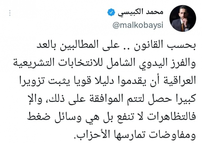 وشدد في تغريدة على حسابه بموقع التدوين المصغر تويتر، اليوم على أنه: "بحسب القانون .. على المطالبين بالعد والفرز اليدوي الشامل للانتخابات التشريعية العراقية أن يقدموا دليلا قويا يثبت تزويرا كبيرا حصل لتتم الموافقة على ذلك".