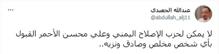 أوضح ذلك في تغريدة عبر "تويتر"، اليوم، قائلا: "لا يمكن لحزب الإصلاح اليمني وعلي محسن الأحمر القبول بأي شخص مخلص وصادق ونزيه".