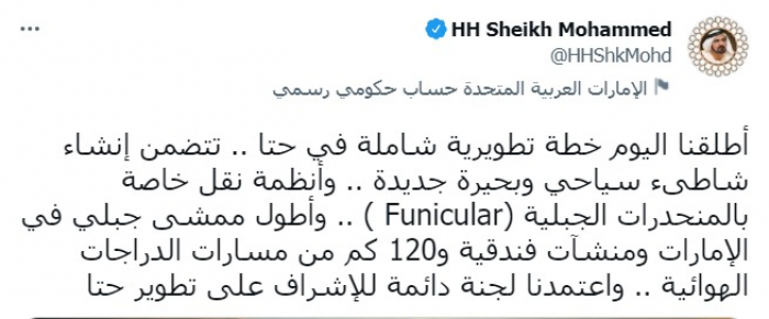 وقال في تغريدة على تويتر، اليوم السبت، إننا: "أطلقنا اليوم خطة تطويرية شاملة في حتا، تتضمن إنشاء شاطئ سياحي وبحيرة جديدة، وأنظمة نقل خاصة بالمنحدرات الجبلية (Funicular )".