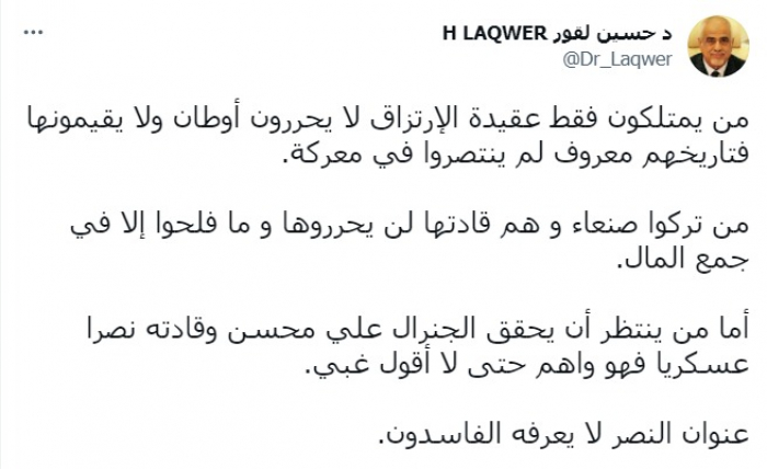 واعتبر أن: "من ينتظر أن يحقق الجنرال علي محسن وقادته نصرا عسكريا فهو واهم حتى لا أقول غبي"، متابعا: "عنوان النصر لا يعرفه الفاسدون".