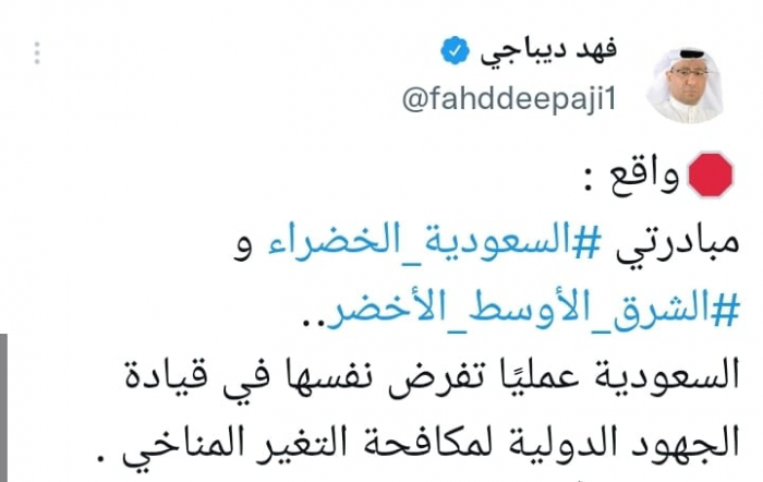وأشار في تغريدة على حسابه بموقع التدوين المصغر تويتر، اليوم إلى أن: " مبادرتي السعودية الخضراء والشرق الأوسط الأخضر، السعودية عمليًا تفرض نفسها في قيادة الجهود الدولية لمكافحة التغير المناخي" .