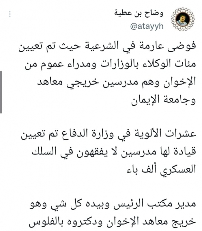 وكشف في تغريدة على حسابه بموقع التدوين المصغر تويتر، اليوم أن هناك: "فوضى عارمة في الشرعية حيث تم تعيين مئات الوكلاء بالوزارات ومدراء عموم من الإخوان وهم مدرسين خريجي معاهد وجامعة الإيمان".