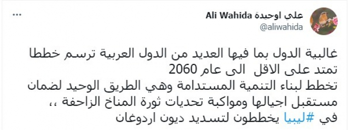 وكتب في تغريدة عبر "تويتر"، اليوم: "غالبية الدول بما فيها العديد من الدول العربية ترسم خططا تمتد على الأقل إلى عام 2060".