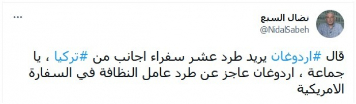 سخر المحلل السياسي اللبناني نضال السبع، من تصريحات أردوغان بشأن طرد 10 سفراء من تركيا، على خلفية مطالبتهم بالإفراج عن المعارض عثمان كافالا.