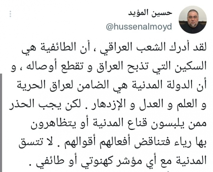 وكتب في تغريدة على حسابه بموقع التدوين المصغر تويتر، اليوم: "لقد أدرك الشعب العراقي، أن الطائفية هي السكين التي تذبح العراق و تقطع أوصاله وأن الدولة المدنية هي الضامن لعراق الحرية و العلم و العدل و الازدهار".