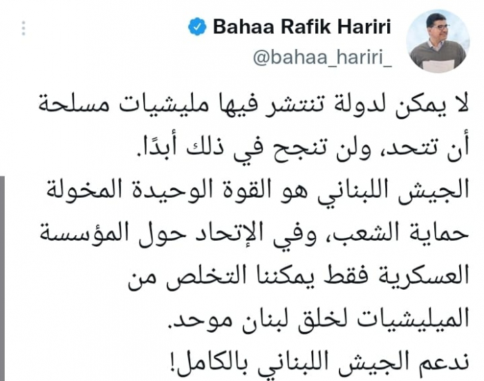 بهاء الحريري ملمحا لحزب الله: لبنان لن يتحد بوجود مليشيا