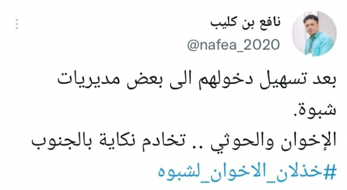 وأكد في تغريدة على حسابه بموقع التدوين المصغر تويتر، اليوم أنه: "بعد تسهيل دخولهم إلى بعض مديريات شبوة، الإخوان والحوثي تخادم نكاية بالجنوب"، مختتما بهاشتاج: "خذلان الإخوان لشبوة".