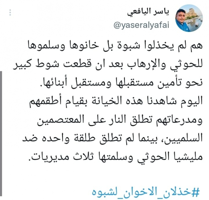 وأكد أننا: "اليوم شاهدنا هذه الخيانة بقيام أطقمهم ومدرعاتهم تطلق النار على المعتصمين السلميين، بينما لم تطلق طلقة واحدة ضد مليشيا الحوثي وسلمتها ثلاث مديريات"، مختتما بهاشتاج: "خذلان الإخوان لشبوة".