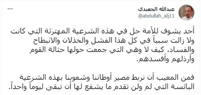 وكتب في تغريدة عبر "تويتر"، اليوم: "أحد يشوف للأمة حل في هذه الشرعية المهترئة التي كانت ولا زالت سببا في كل هذا الفشل والخذلان والانبطاح والفساد، كيف لا وهي التي جمعت حولها حثالة القوم وأرذلهم وأفسدهم".
