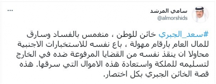 وأوضح في تغريدة عبر "تويتر"، اليوم، أن: "سعد الجبري خائن للوطن، منغمس بالفساد وسارق للمال العام بأرقام مهولة".