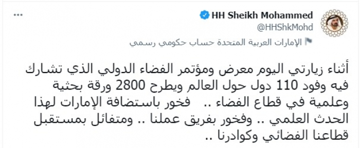 ولفت إلى المعرض في تغريدة عبر "تويتر"، اليوم، قائلا: "تشارك فيه وفود 110 دول حول العالم ويطرح 2800 ورقة بحثية وعلمية في قطاع الفضاء".