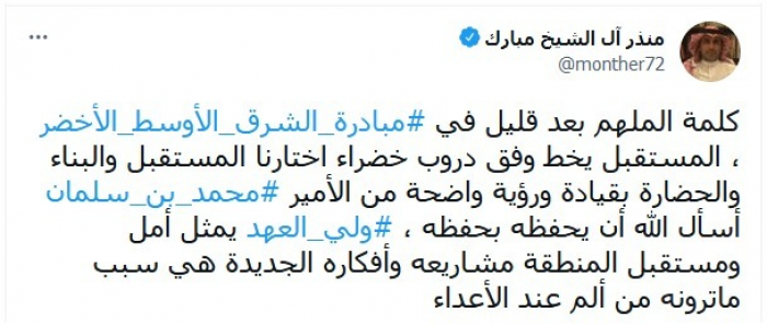 أثنى المدون السعودي البارز منذر آل الشيخ مبارك، على الجهود التي يبذلها ولي العهد السعودي الأمير محمد بن سلمان، بالتزامن مع افتتاح مبادرة الشرق الأوسط الأخضر، مؤكدا أن هذه المشاريع تسبب الألم للأعداء.
