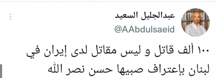 وأكد في تغريدة على حسابه بموقع التدوين المصغر تويتر، اليوم أن هناك: "100 ألف قاتل وليس مقاتل لدى إيران في لبنان باعتراف صبيها حسن نصر الله".