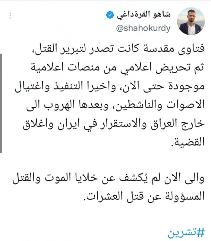 وأوضح في تغريدة على حسابه بموقع التدوين المصغر تويتر، اليوم أن: "فتاوى مقدسة كانت تصدر لتبرير القتل، ثم تحريض إعلامي من منصات إعلامية موجودة حتى الآن، وأخيرا التنفيذ واغتيال الأصوات والناشطين، وبعدها الهروب الى خارج العراق والاستقرار في إيران وإغلاق القضية".