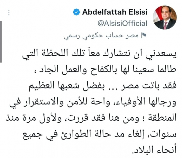 وأضاف: "فقد باتت مصر بفضل شعبها العظيم ورجالها الأوفياء، واحة للأمن والاستقرار في المنطقة"؛ مستطردا: "ومن هنا فقد قررت، ولأول مرة منذ سنوات، إلغاء مد حالة الطوارئ في جميع أنحاء البلاد".