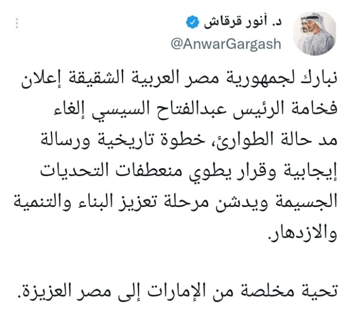 هنأ الدكتور أنور قرقاش المستشار الدبلوماسي لرئيس دولة الإمارات العربية المتحدة، الرئيس المصري عبدالفتاح السيسي، على قرار إلغاء حالة الطوارئ، مشيرا إلى أنه قرار يفتح صفحة جديدة بعد تحديات كبيرة.