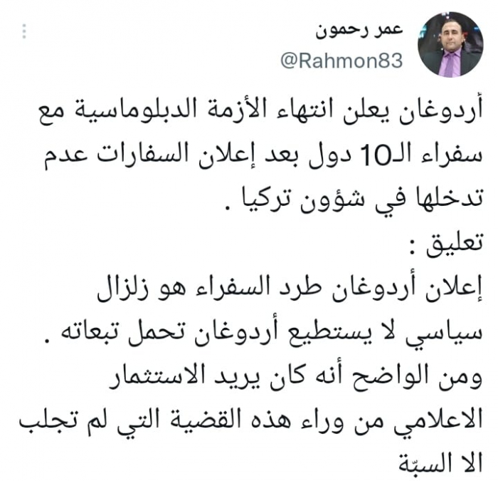 وأكد في تغريدة على حسابه بموقع التدوين المصغر تويتر، اليوم أن: "أردوغان يعلن انتهاء الأزمة الدبلوماسية مع سفراء الـ 10 دول بعد إعلان السفارات عدم تدخلها في شؤون تركيا".