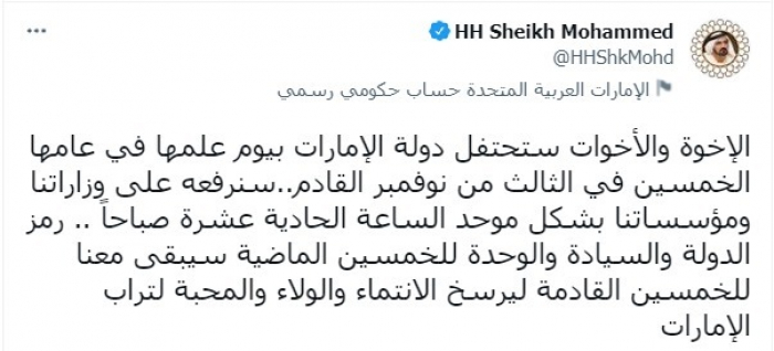 دعا الشيخ محمد بن راشد آل مكتوم، نائب رئيس دولة الإمارات رئيس مجلس الوزراء حاكم دبي، لرفع علم الإمارات على الوزارات والمؤسسات، في 3 نوفمبر المقبل.