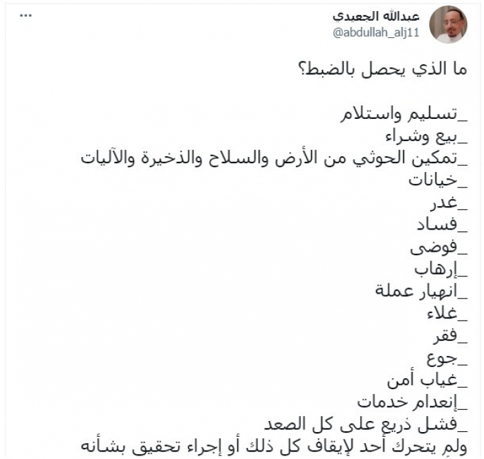 استنكر الشاعر عبدالله الجعيدي، التقاعس تجاه التجاوزات والجرائم التي ترتكبها الشرعية الإخوانية بعدما افتعلت حرب الخدمات بالتزامن مع انكساراتها وهزائمها المتتالية وعدم تحقيق أي نصر يذكر.