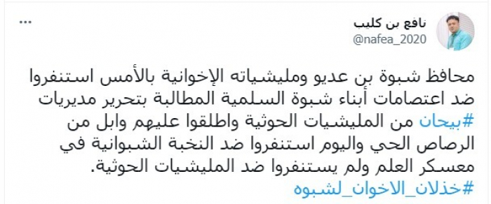 وأوضح: "محافظ شبوة بن عديو ومليشياته الإخوانية بالأمس استنفروا ضد اعتصامات أبناء شبوة السلمية المطالبة بتحرير مديريات بيحان من المليشيات الحوثية وأطلقوا عليهم وابل من الرصاص الحي".